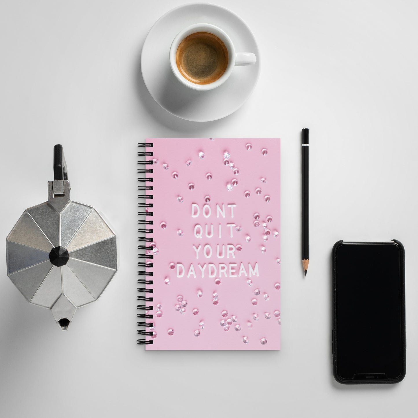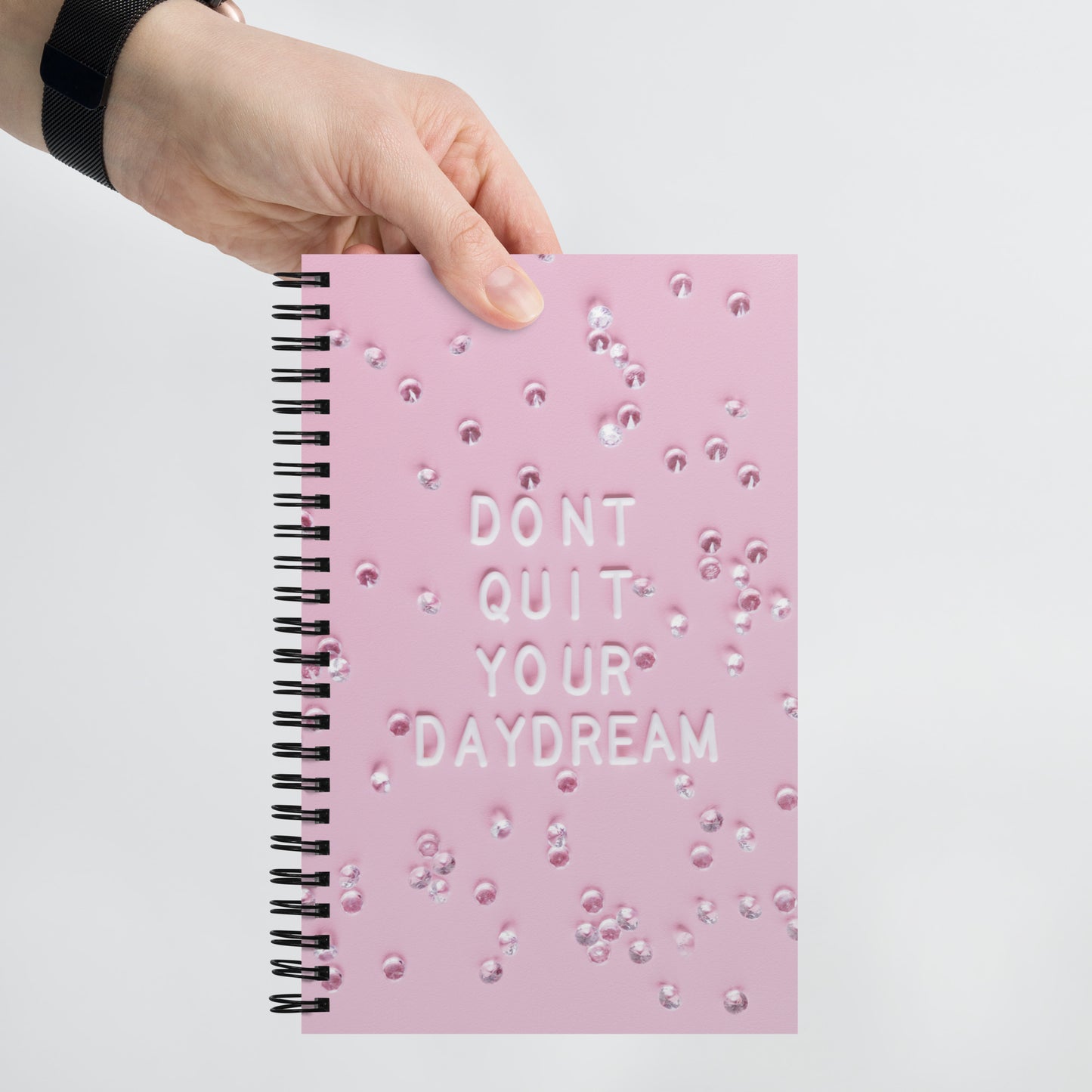 Take notes, jot down ideas, and document your future dreams in style. With a soft-touch coating and sturdy wire-o binding, this custom notebook is the perfect daily companion for putting your thoughts on paper. It includes 140 dotted pages and measures 5.25" x 8.25" (13 x 21 cm).